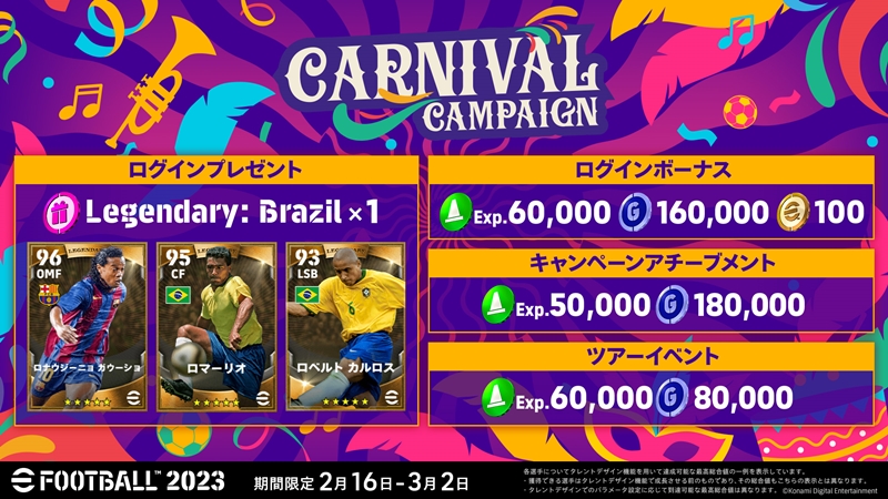 サッカー大国ブラジルなどで開催されるカーニバルに合わせた「Carnival Campaign」では、ログインするだけでブラジル国籍のレジェンド選手が獲得できる「抽選契約権」や、「eFootballコイン」を入手することが可能。