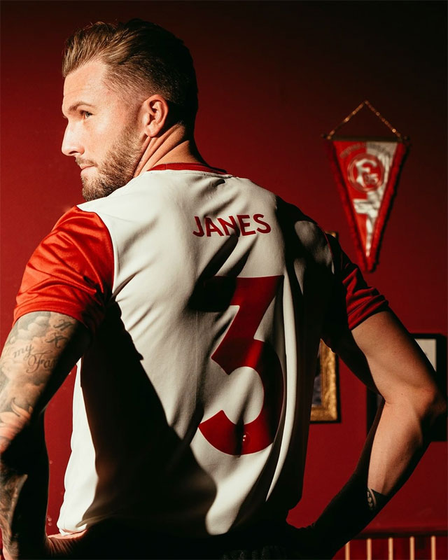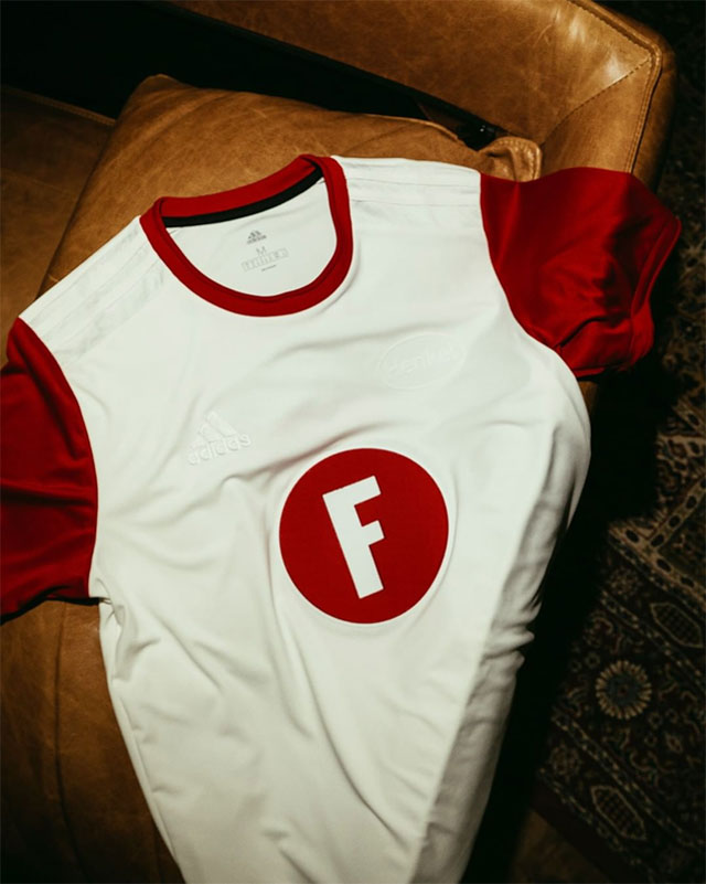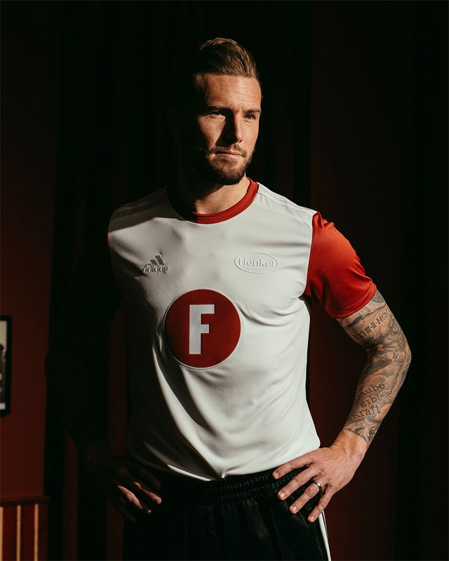 通常の胸スポンサーロゴ「Henkel」は左胸に位置を変え、シャツと同系色で控え目に。代わりに胸の中央には昔と同じように、当時のクラブロゴ「F」マークを配する。レジェンドが着たユニフォームに可能な限り近づけたデザインである。
