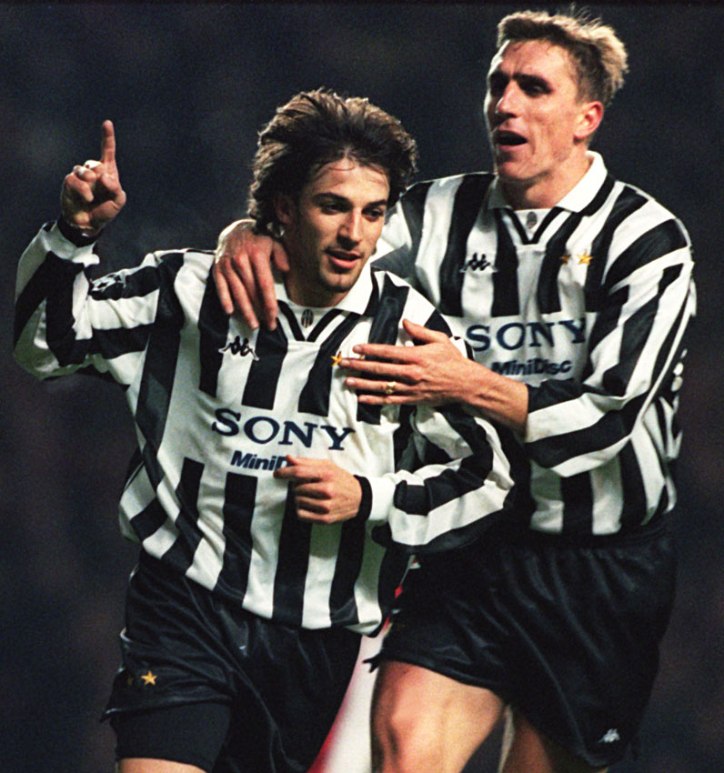 襟付きユニといえばユヴェントスも外せない。白黒ストライプに白い襟というデザインの美しさは、90年代のセリエAを代表する一着。