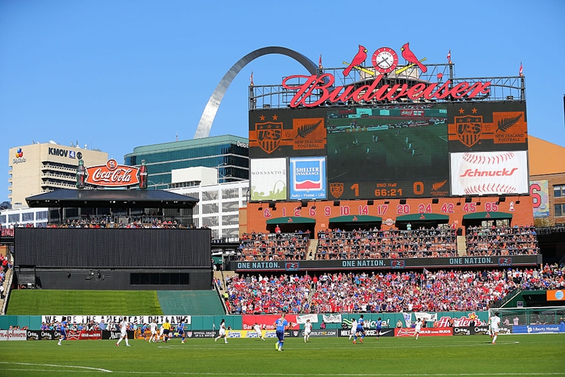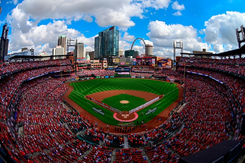 外野が開けた造りで、奥に見えるセントルイスのシンボルであるゲートウェイ・アーチが印象的なスタジアム。
