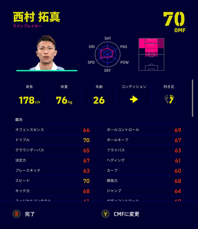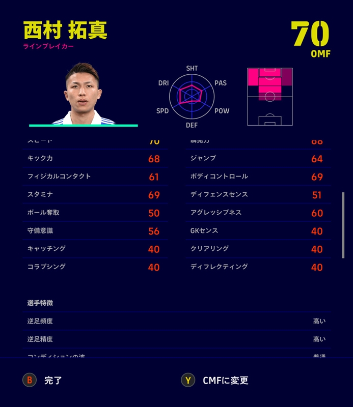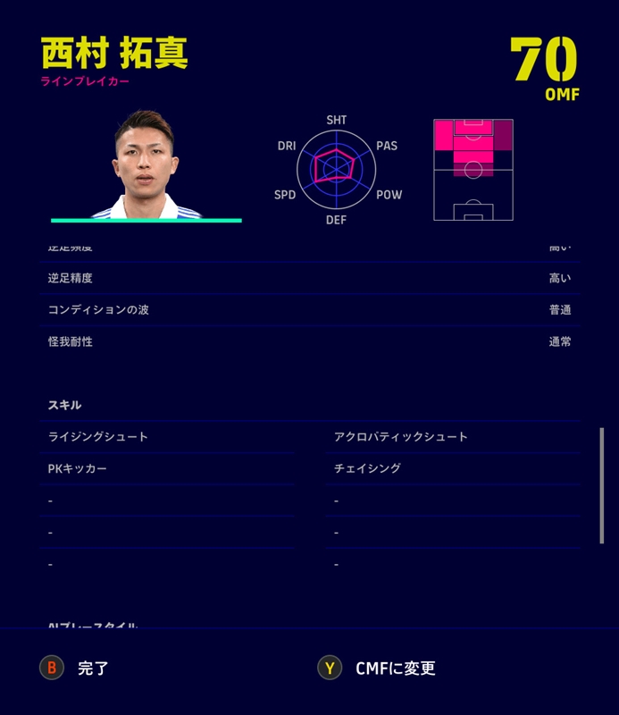 ポジション適性の広さに表れているように攻守一体のプレースタイルが特徴。シュート系の他に「チェイシング」のスキルを持っている点が西村らしい。