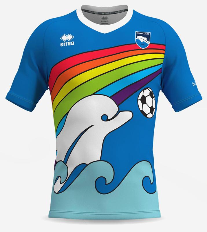 当時セリエBを戦っていたペスカーラが2020年に発表した特別ユニフォーム。クラブは「コロナウイルスを蹴っ飛ばせ」というキャンペーンを展開し、ファンから特別ユニフォームに採用するデザインを募集。その結果、6歳の男子が描いた「虹、海、イルカ(クラブのマスコットだ)、サッカーボール」という希望に満ち溢れたデザインが選ばれた。