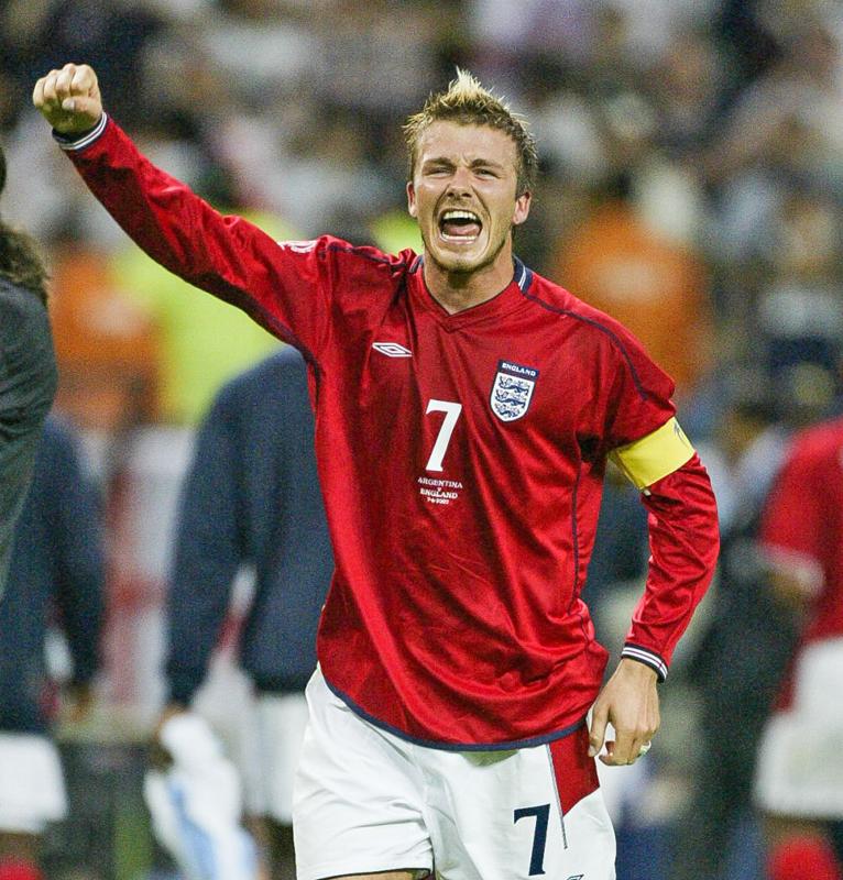 それから4年後の日韓W杯でのアルゼンチン戦。一回り成長した“キャプテン”ベッカムは44分に得たPKを迷うそぶりもなく叩き込み、見事にチームを勝利に導いた。この赤いアウェイユニフォームにはベッカムの雄叫びが重なる。