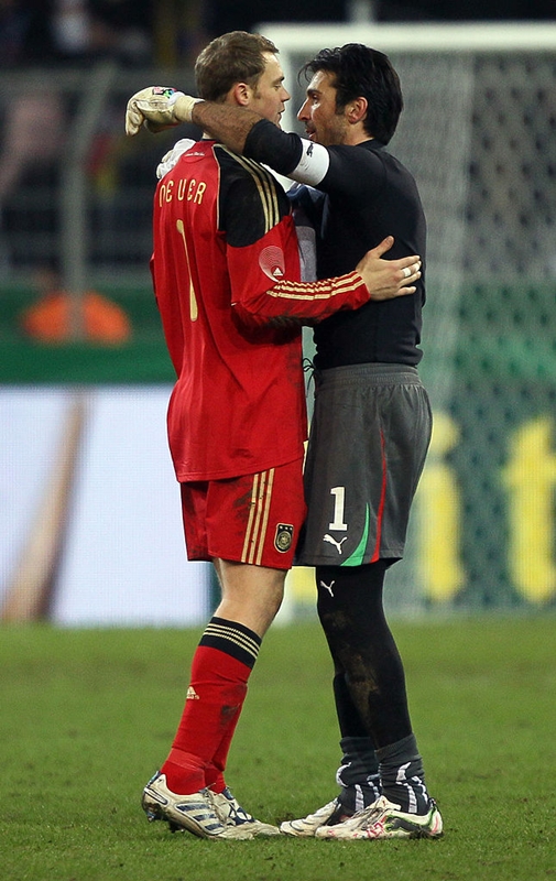 マヌエル・ノイアーとお互いのプレーを称え合う試合後、しかし足もとには「パワーキャットTOKYO」。