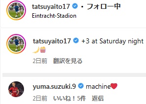 シント=トロイデンでともにプレーした鹿島アントラーズFW鈴木優磨はSNS上で「machine」とハートの絵文字付きでメッセージを送っていたぞ。