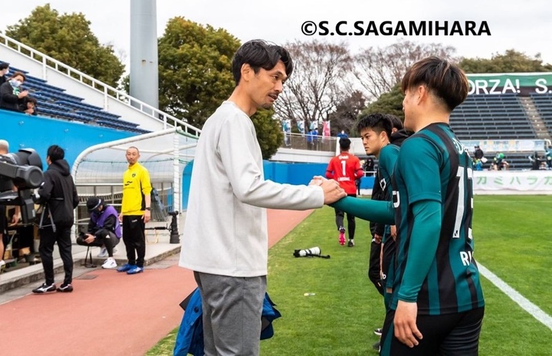 第2節の福島戦で初ゴールを挙げ、試合後に戸田監督(左)と握手する吉武選手。写真提供:SC相模原