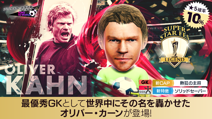 好評配信中のスポーツ育成シミュレーションゲーム『プロサッカークラブをつくろう! ロード・トゥ・ワールド』は、2023年4月26日(水)より、レジェンド「オリバー・カーン」をはじめとした世界のスーパースターたちが新★5選手として登場する“SUPER STAR