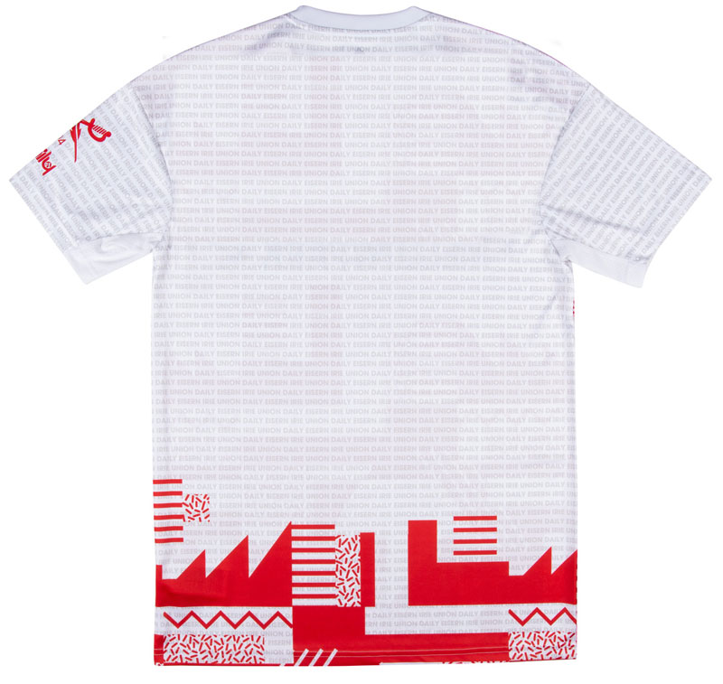 独特な幾何学パターンが強く印象に残る今回の限定コラボユニフォーム。ウニオンの定番キットカラーであるホワイトとレッドを基調に、クレイジーフレッシュと呼ばれるIriedailyの特徴的なパターンが使われている。