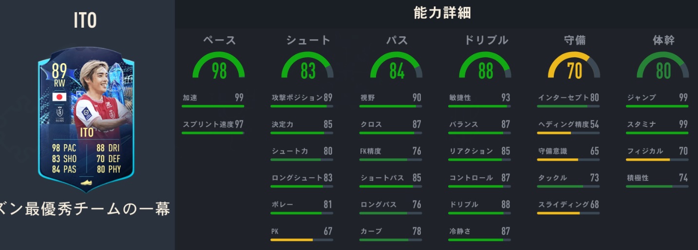 総合値89に爆上げされた伊東の詳しい能力値がこちら。
