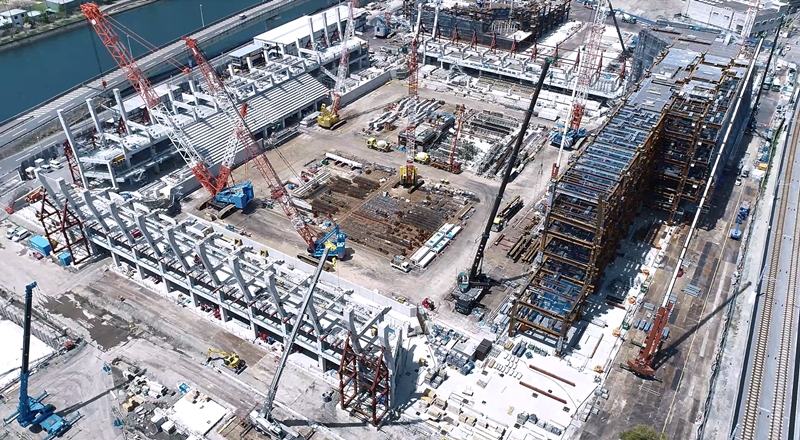2023年4月末時点での工事進捗率は全体工程の約21.7%が完了。現在、地上6階まで建設するスタジアム棟は3階観客席まで、地上14階まで建設するホテル棟は7階まで建ち上がっており、アリーナ棟は座席の形が見え始めているという。