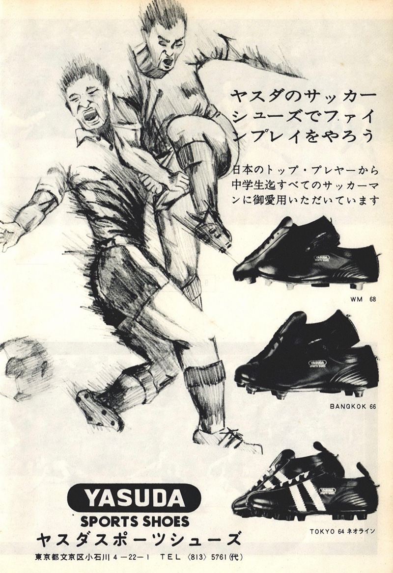 当時の雑誌では広告はスパイクがほとんどで、今のようにサッカーユニフォームや一般的な商品といったものは見受けられない。