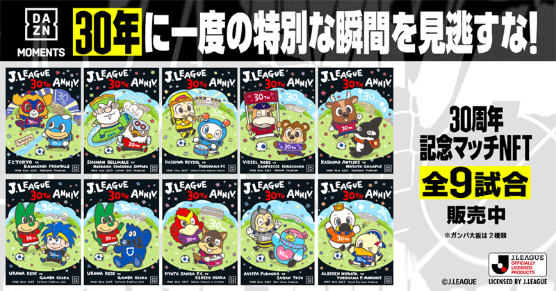 これに合わせて、JリーグのパートナーであるDAZNは8日、MIXI社と開発・運用を行うスポーツ特化型NFT(Non-Fungible Token/非代替性トークン)のマーケットプレイス「DAZN MOMENTS」にて、「Jリーグ30周年記念マッチNFT(全10種)」、「Jリーグ30周年記念 Jリーグキング『やべっちスタジアム』黒木ひかりエディション(1種)」の販売を開始した。