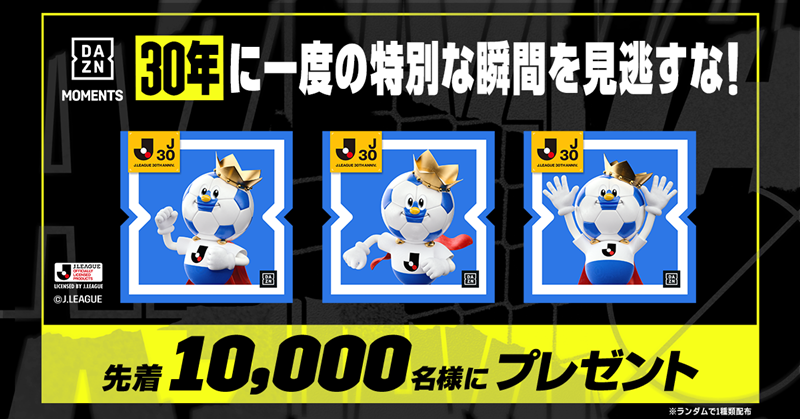 さらに、先着10,000名にJリーグの30周年を記念して制作したJリーグキングのNFT 3種類のうち、1種類をランダムでプレゼントする「Jリーグ30周年記念Free NFTキャンペーン」も現在実施中だ。「DAZN MOMENT」が気になっていた方はチャンス!