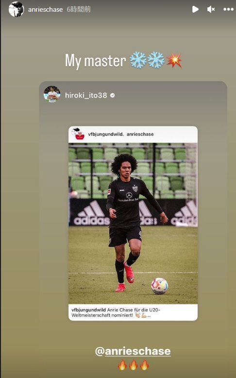 すると、シュトゥットガルトのトップチームでプレーする日本代表DF伊藤洋輝もこの一報に反応。炎の絵文字をつけて後輩にエールを送っていた。