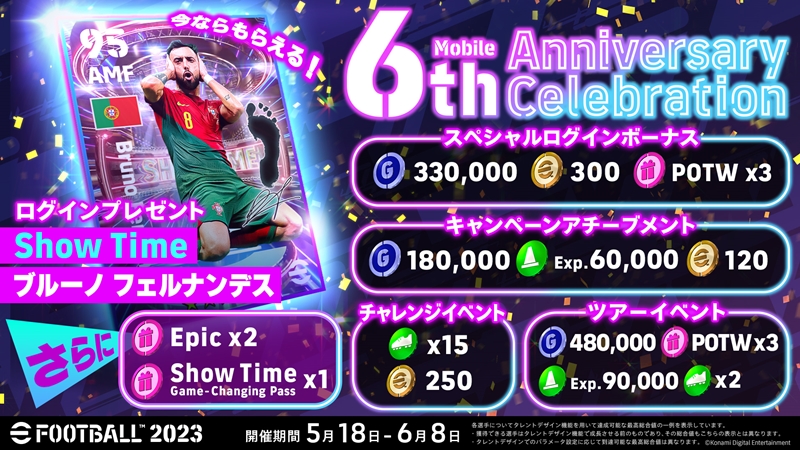 KONAMIは18日、モバイル版『eFootball™ 2023』が6周年を迎えたことを記念し、様々なキャンペーンを実施することを発表した。