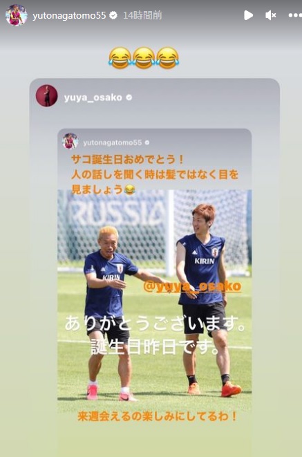これに大迫は「ありがとうございます。誕生日昨日です。」と冷静に突っ込むと、長友は泣き笑いの絵文字で答えていた。