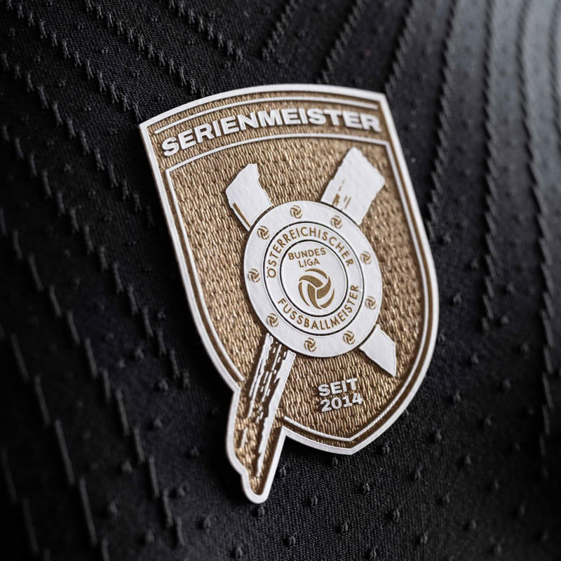 エンブレムもキットカラーに合わせてブラック&ゴールドに。胸部中央には10連覇を記念して、10を意味するX(エックス)をデザインした特別エンブレムを装着する。