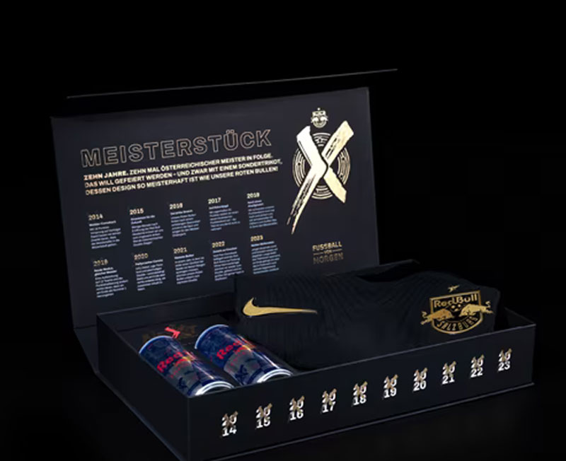 限定販売されるこの記念ユニフォームは特別な装丁のボックスに収納。この限定ユニのために作られたエナジードリンク「Red Bull」のチャンピオン缶が2本付くという、少々珍しい組合せでの販売となる。