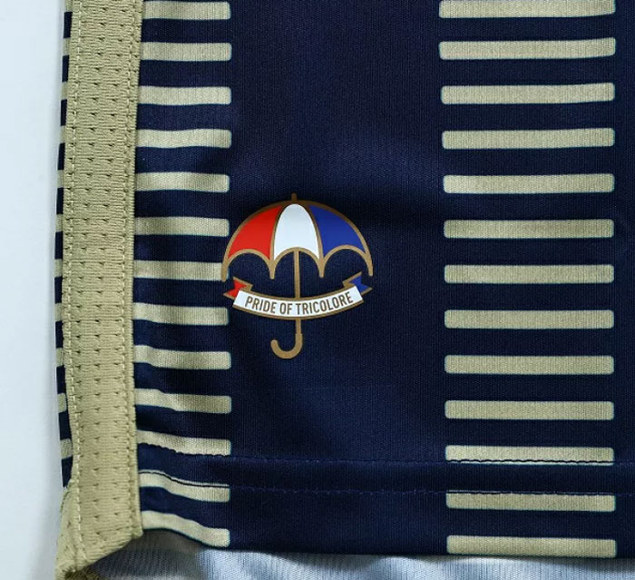 前面裾部分にはサポーターの歓喜を願ったトリパラ(トリコロール・パラソル)をプリント。今やマリノスのユニフォームに必要不可欠なロゴマークだ。