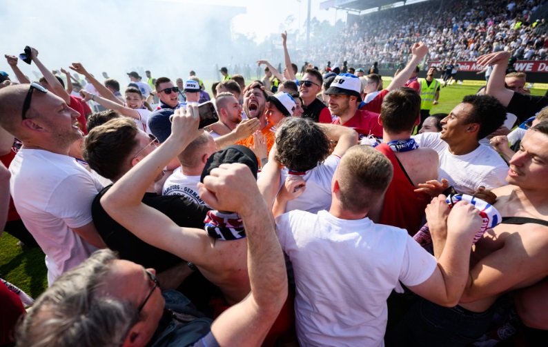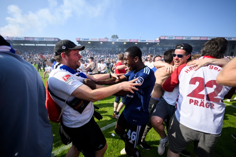 2018–19シーズンにクラブ史上初めて2部に降格して以降、苦しんできたハンブルク。ザントハウゼンとの最終戦に0-1で勝利すると、サポーターがピッチ上になだれ込み、選手とともに歓喜を爆発させた。