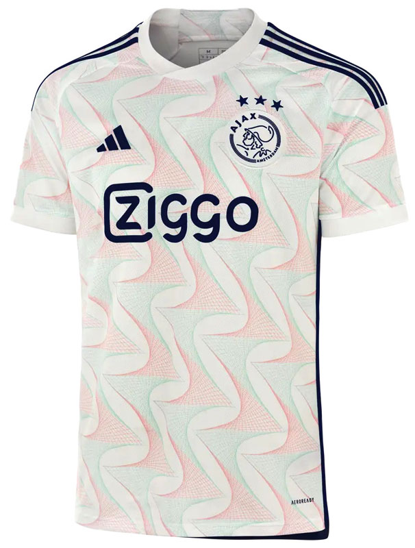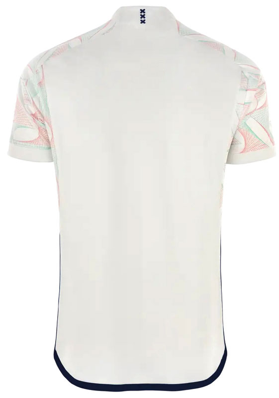2023-24新アウェイユニフォームは非常に珍しいホワイトを基調としたデザイン。ホームキットがレッドとホワイトのアヤックスは、アウェイではブルーやブラックなど対極にあるような濃い色を使うことが多い。