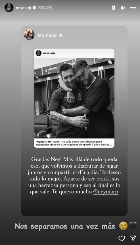 ネイマールはメッシからの返信に「僕らはまたお別れだね…」と泣き顔の絵文字つきで返していた。