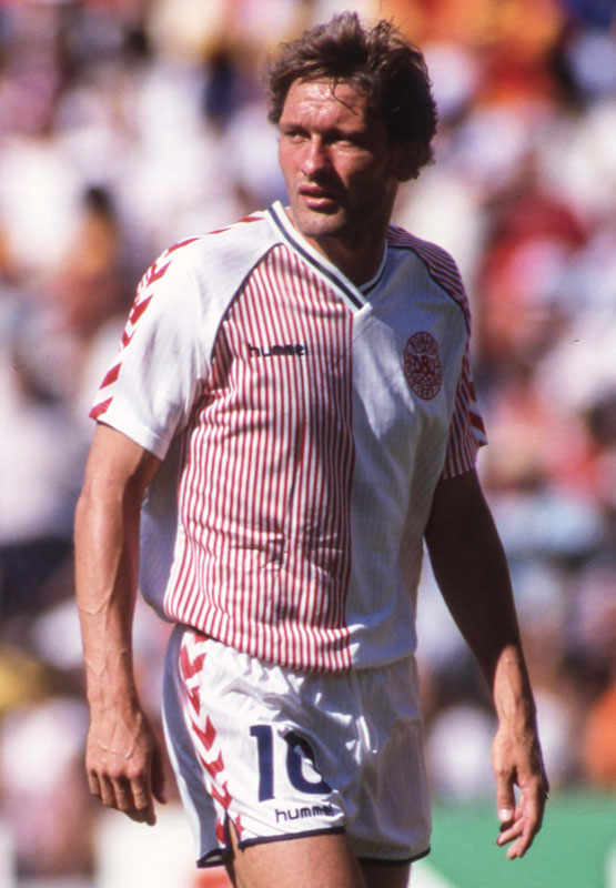 上の選手(プレーベン・エルケーア・ラルセン)の写真が1986W杯での1枚。襟のラップオーバーは左右逆だが、同じhummelが手掛けているためほぼ“完コピ”である。