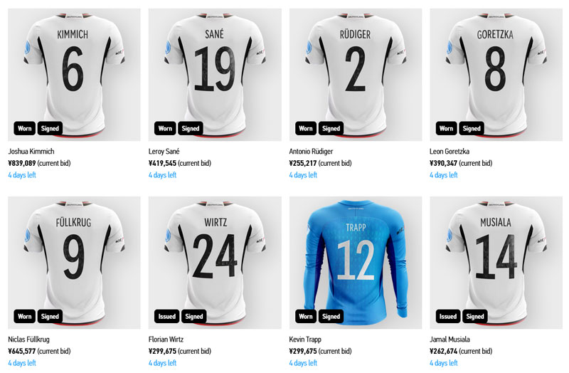 画像は13日夜時点のもの。一部分だがこのような感じで出品されている。ちなみに一番人気はヨシュア・キミッヒ(6番)で、入札額は日本円で839,089円。恐らくまだまだ上昇するだろう。