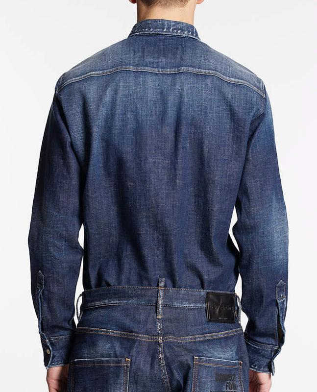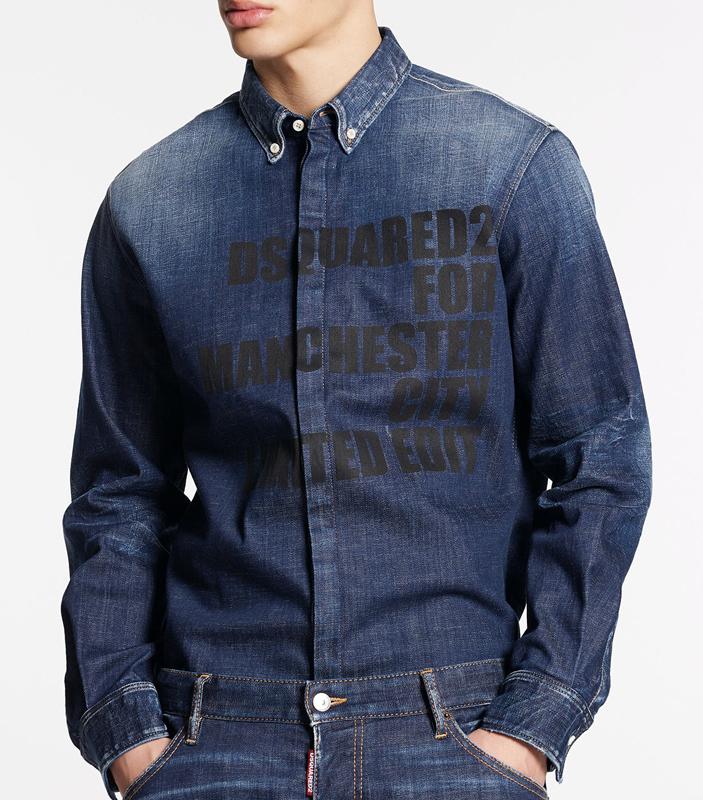 ストレッチコットンのデニムシャツ。襟はボタンダウン。胸部に“DSQUARED2 FOR MANCHESTER CITY LIMITED EDITION”を大胆に配置。イタリア製。