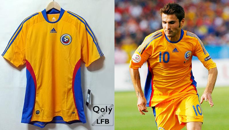 この画像はルーマニア代表の2008モデル。レプリカユニ(左)では袖口まである3本線が、EURO2008での選手用だとバッジスペース確保のために途中で止まっている。