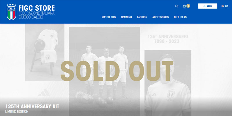 たったの2,023着という超限定販売品は、当然のごとくあっさりと完売に。FIGCの公式ストアではこのように無慈悲で冷淡なSOLD OUT画像が表示され、もはや商品販売ページに入ることすら出来ない状態となっている。