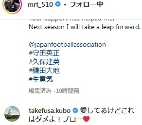 久保が守田の肩で寝る写真も公開していたが、久保は「愛してるけどこれはダメよ!ブロー(兄弟)」とハートの絵文字つきでコメント。