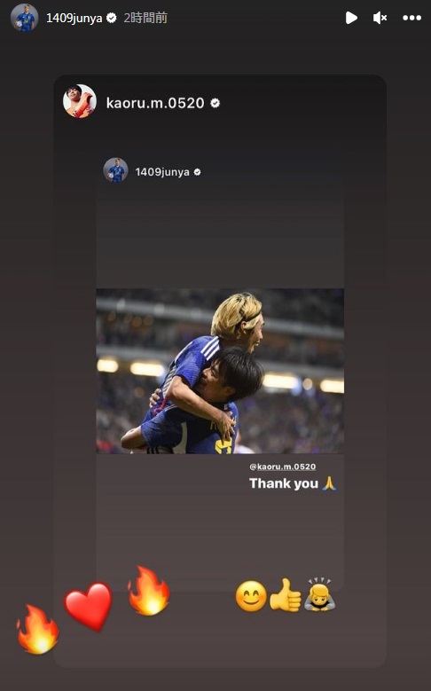また、右サイドでコンビを組んだ菅原由勢は「オーバーラップしようとしたら早すぎた」とコメントしており、伊東は「ナイスパス でかーい」と炎の絵文字つきで返信。この「でかーい」というワードは他の選手たちも使っており、日本代表内で流行っているようだ。