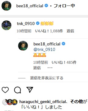 また、林大地は「上ポンおめでとう」とお祝いのコメント。そして、上田に抱きつかれていた沖悠哉は「綺世くん、改めておめでとう」とハートの絵文字つきでメッセージを送っている。