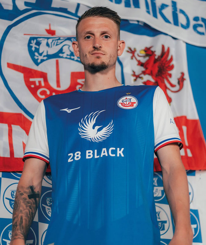 袖口はホームタウンであるロストックの紋章(そしてチームエンブレム)と同じブルー/ホワイト/レッドのストライプで彩り、クラブと街のつながりを強調した。