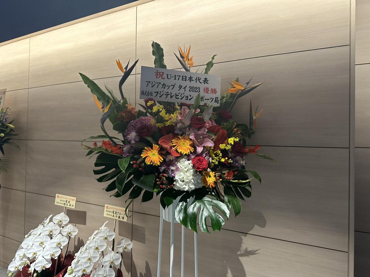 入り口には移転及びU-17アジア杯優勝を祝う花束が早くも飾られていた。おめでとう若き侍たち!