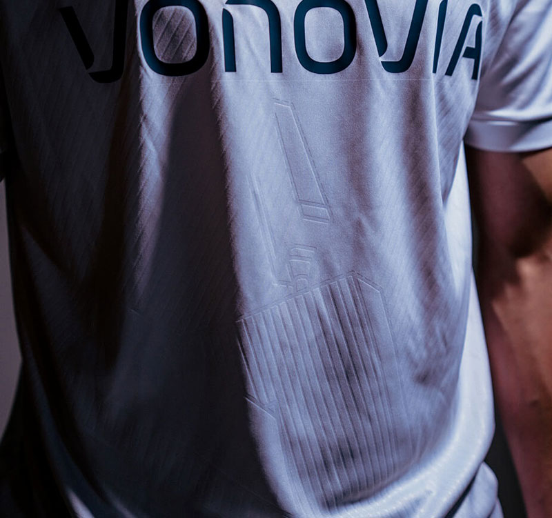 前面のエンボスグラフィックは、ホームスタジアムの四隅にそびえ立つ照明塔や屋根などの外観を表現したもの。敵地でもホームを感じられるようにとデザインしたものだ。