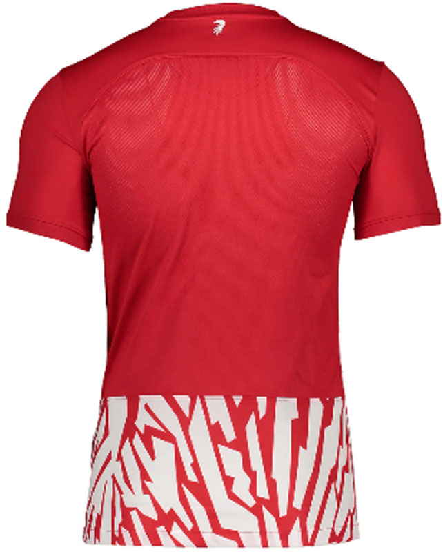 23-24新ホームユニフォームは大胆なグラフィックが目を引くデザイン。レッドとホワイトで幾何学的な模様を描くが、そのコンセプトは不明。