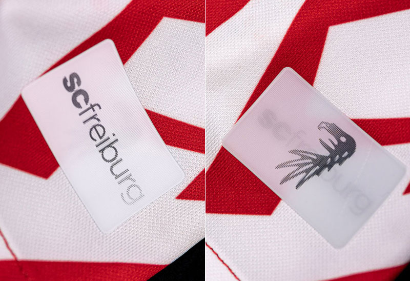 シャツの左裾には、見る角度によってエンブレムとチーム名が入れ替わるホログラムタグ付き。ちなみにフライブルクのエンブレムに描かれている動物は、鷹の上半身と獅子の下半身を持つ神話上の生き物グリフォンである。