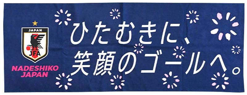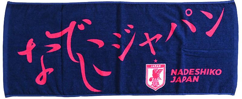 ネイビーを基調にピンクの“なでしこジャパン”が鮮やかなフェイスタオル。応援時にはタオマフ代わりに両手で広げられるサイズだ。