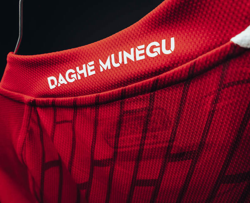 背面襟部分には“Daghe Munegu”(行けモナコ)をレタリング。今回はレッドの部分に55度の角度で四角いグラフィックをデザインし、このユニを独特なものへと仕上げている。