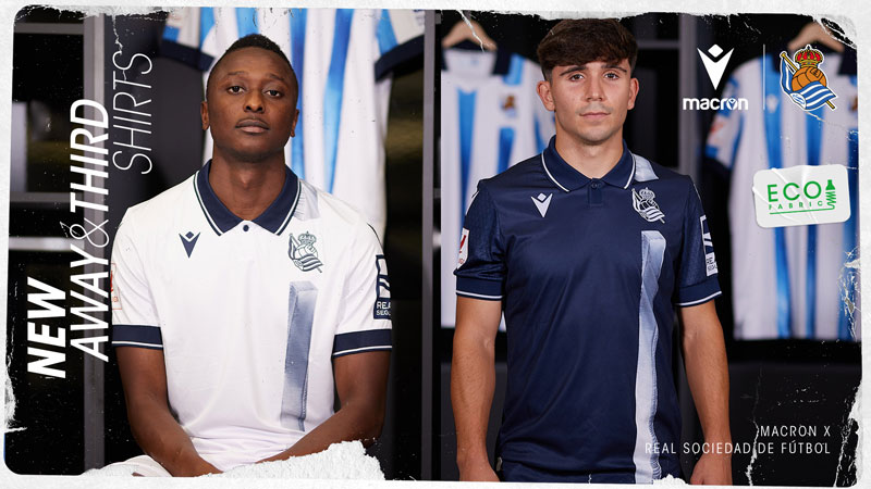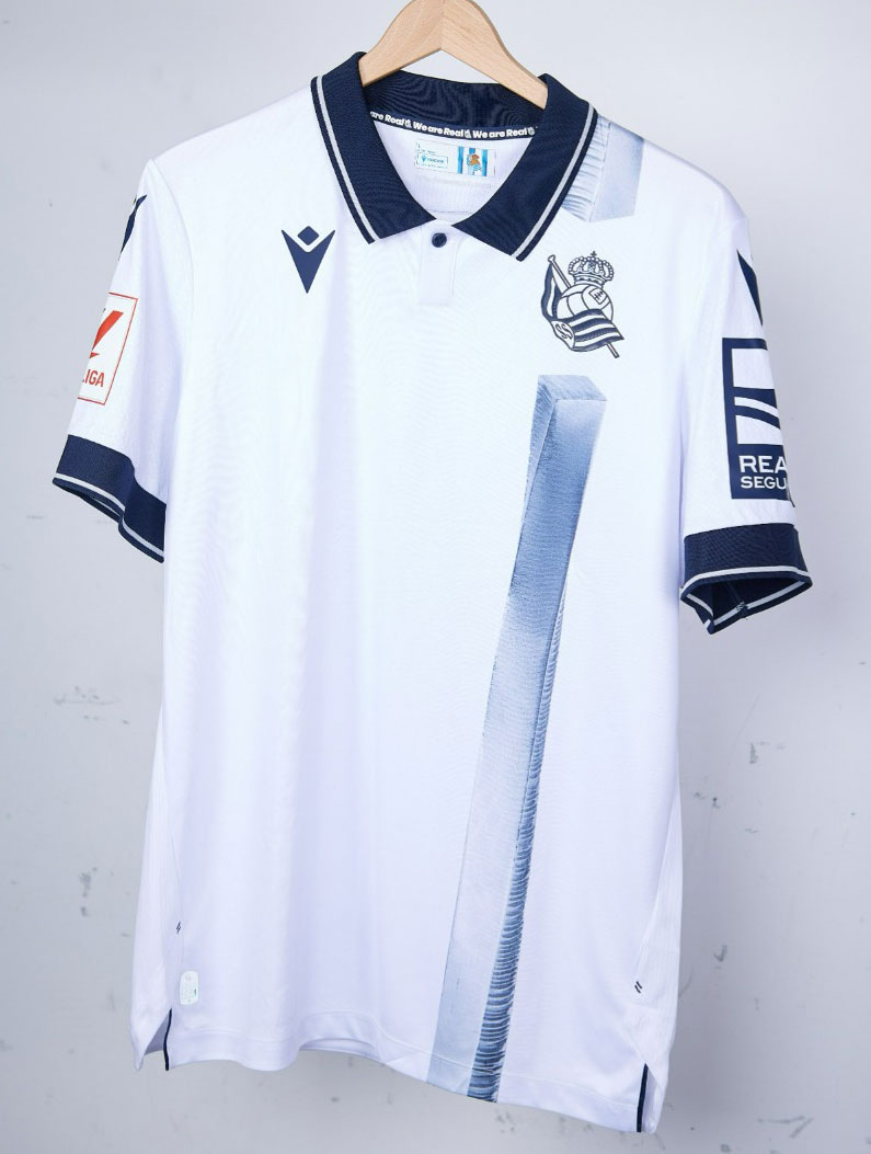 アウェイとサードはどちらもエンブレム側に立体デザインのストライプを配する。これは23-24ホームキットに描かれたものと同じで、バスク地方を拠点に活動するソシエダファンの彫刻家イニゴ・マンテローラによるものだ。