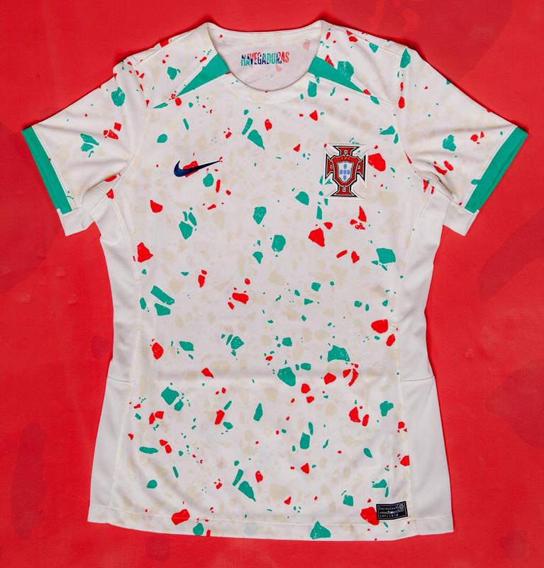 オフホワイトを基調とし、シャツ全体に散りばめたモザイク模様が可愛いらしいユニフォーム。このデザインは、小石を敷き詰めて模様を描く国の有名な歩道「ポルトガル式歩道」にインスパイアされている。