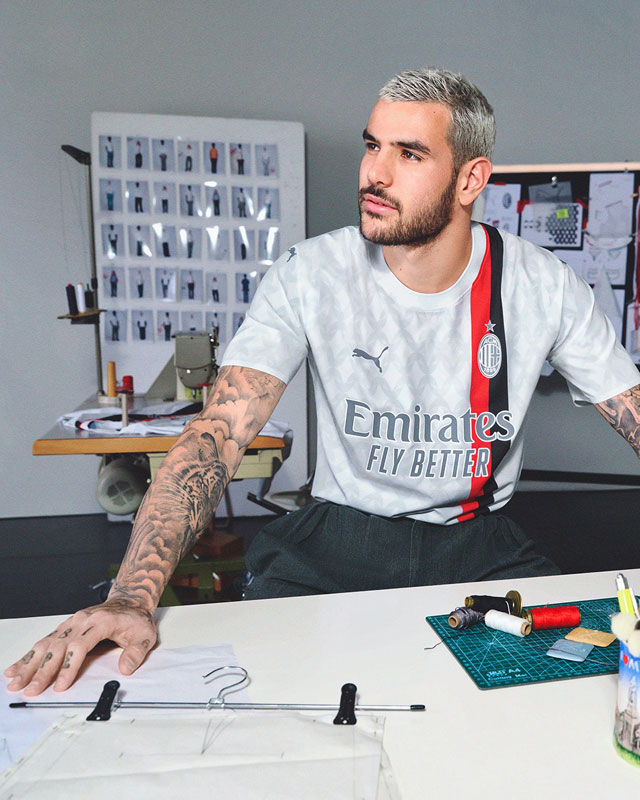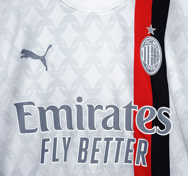 シャツを覆うウェーブ状のグラフィックは、胸のエンブレムをモチーフにミラノの伝統的なファッションスタイルでアレンジしたもの。常にフットボールとファッションがその中心に存在する都市ミラノのチームらしいデザインだ。
