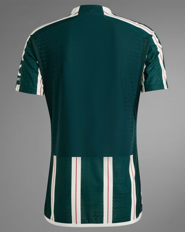 23-24新アウェイユニフォームは、ナイトグリーンとホワイトを基調としたストライプ柄を採用。22-23サードユニに引き続きグリーン系カラーの採用となった。