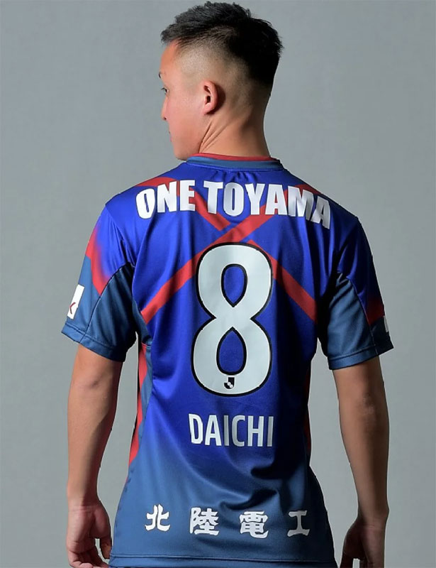 「X」を描くのはユニフォームの前面とは限らない。カターレ富山は2022年モデルから背中に「X」のデザインを継続中。