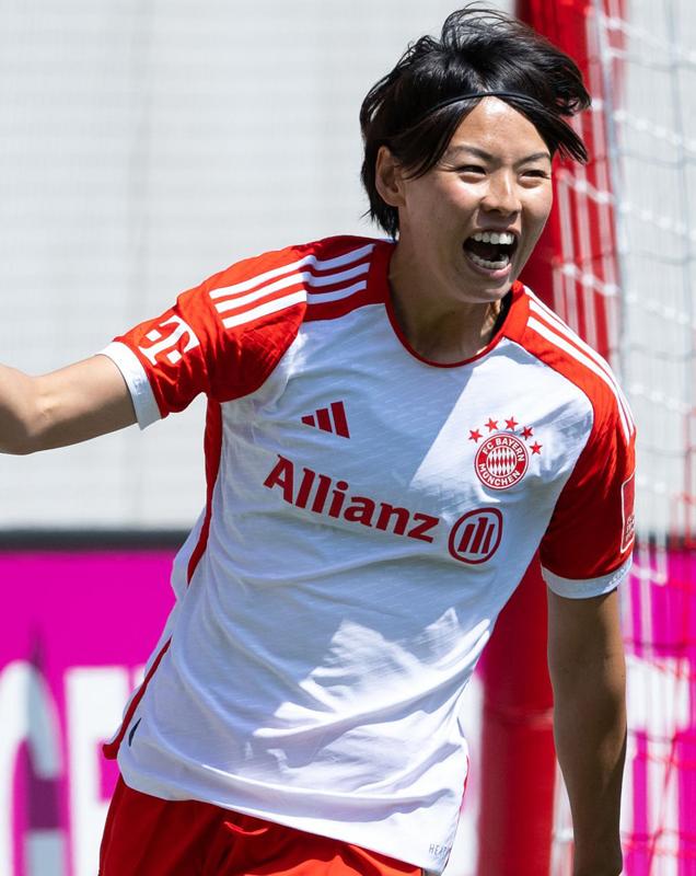 今大会のなでしこジャパンでキャプテンを務める熊谷。2022-23シーズンまではドイツのバイエルンに所属していたが、23-24シーズンはローマ(イタリア)への移籍が決定した。画像のユニフォームはバイエルンの23-24モデルだが、昨季終盤で着用している。