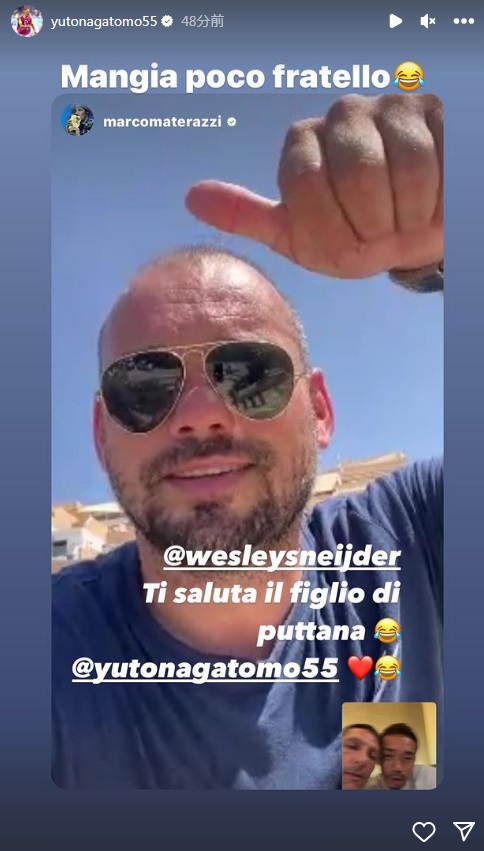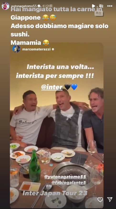 2人は焼肉を満喫した模様。長友が「君は日本中の肉を食べちゃった。いまは寿司だけ食べなきゃいけないよ」とジョークを飛ばすと、マテラッツィも「君はテーブルさえ食った」とやり返していた。