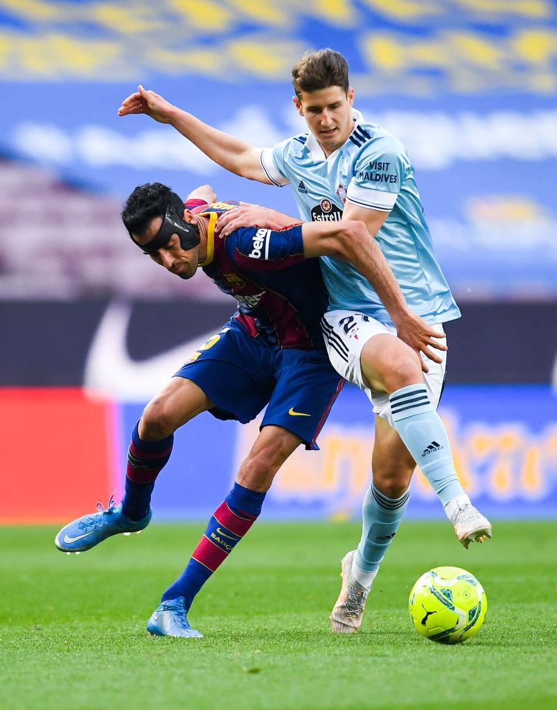 今夏リオネル・メッシを追ってアメリカに渡り、インテル・マイアミでチームメイトになったブスケツ。この試合ではヘッドギアを着用してプレーしていた。