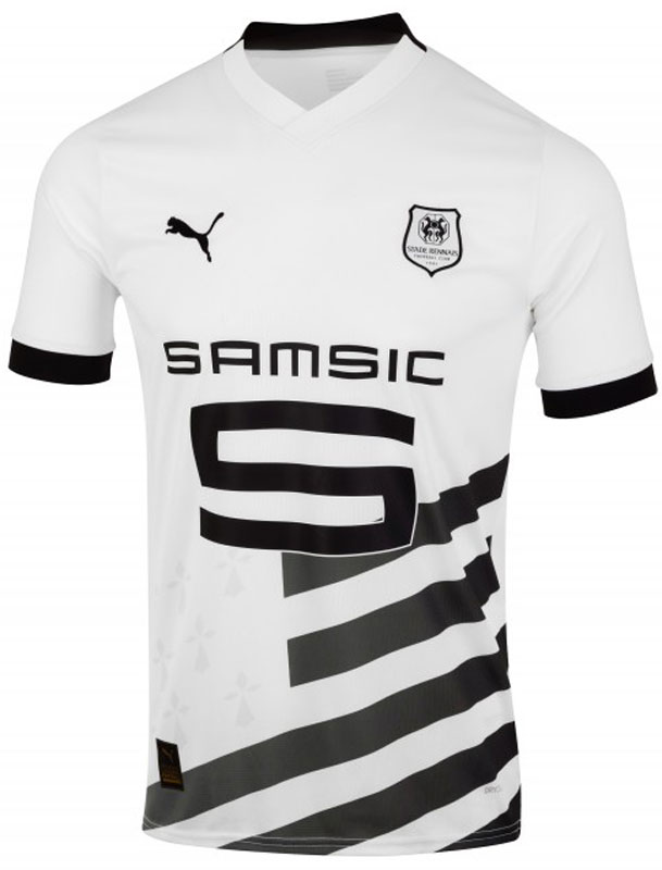 23-24新アウェイユニフォームは、ホワイトを基調にブラックを組み合せた配色で、“Gwenn Ha Du”(グウェン・ア・ドゥ)とクラブは説明する。これはホームタウンのレンヌが属するブルターニュ地方の言葉で「白と黒」の意味。今回のキットカラーそのものである。
